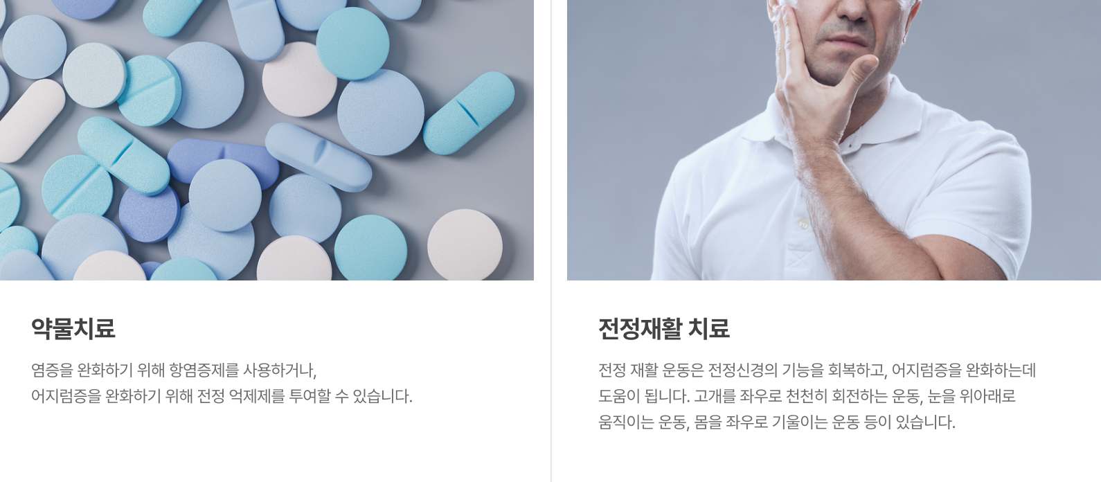 급성기에는 어지럼증을 완화하기 위해 전정 억제제를 사용하며 만성기에는 전정 재활 운동을 통해 평형 기능을 회복하는 치료를 진행합니다.